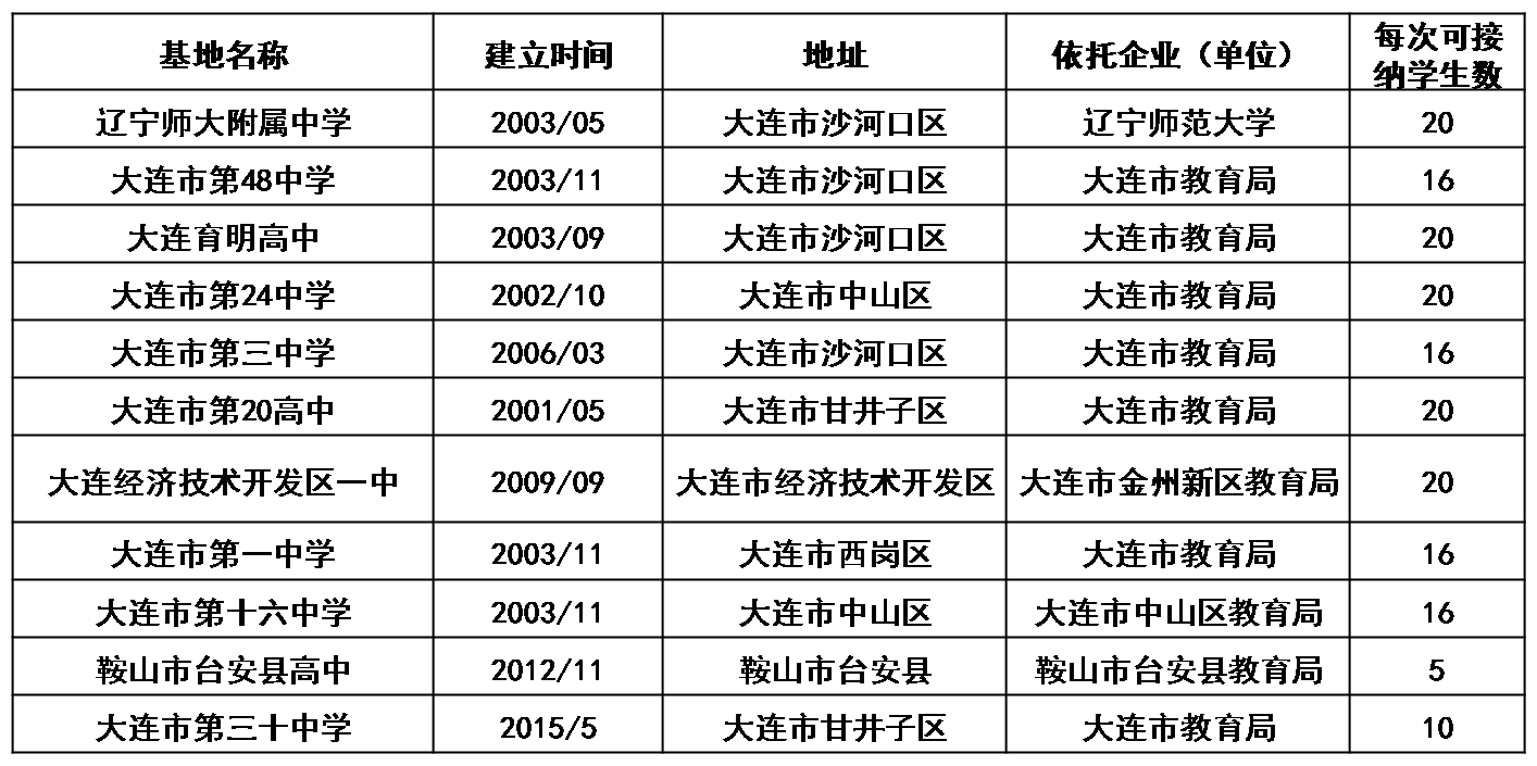 校外实习实训基地是对学生进行实践能力训练、职业素质培养的重要场所,同时对教师在实践锻炼,应用研究、技术开发、新技术的推广应用等方面发挥着重要作用。化学专业实习实训基地建设,紧密结合人才培养目标,结合专业特点、教学改革的实际需要和地缘优势,与大连市区及开发区、辽宁省鞍山市等地多所高中建立了能满足本专业学生校外实习实训的稳定校外实习、实训基地。此外,大连水泥厂、大连污水处理厂、大连玻璃厂、大连多相触媒有限公司及大连高佳化工有限公司是本专业的工业见习基地。进行通过实习实训,学生取得岗前实际工作经验,培养了团队协作精神、组织管理能力和领导艺术才能等个人综合素质,为学生今后从事各项工作打下基础。(实习基地协议书汇总见附件2)