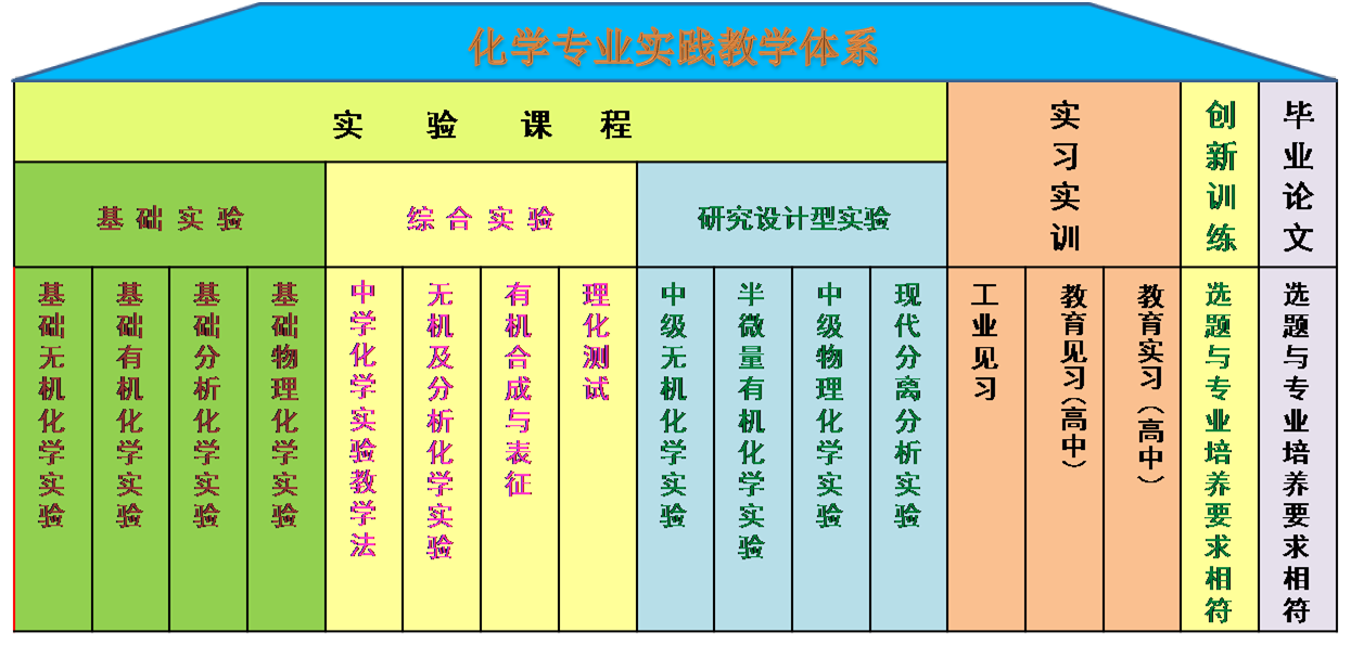 化学专业特色突出,培养目标明确,依托省级实验教学 。围绕“创建特色、培养能力、注重应用”构建一套了符合化学专业特色的突出教师教育技能、研究和应用能力培养的实践教学体系:(1)实验课程体系由《基础实验》《综合实验》《研究设计实验》三个层次实验课程群组成,呈现三种实验形式—课堂教学实验、课后开放实验、科研创新实验,完成三种结合—实验内容与理论内容结合、实验内容与教师科研结合、实验内容与生产实际结合。既保证了主干学科基础,又兼顾了专业特色,同时支撑了人才类型的能力培养。(2)校外实习实训、创新训练、毕业论文等实践教学环节,实现了“现场参观、现场提问、现场解答、现场制订解决方案”的教学方法,增强了毕业生的就业竞争力。