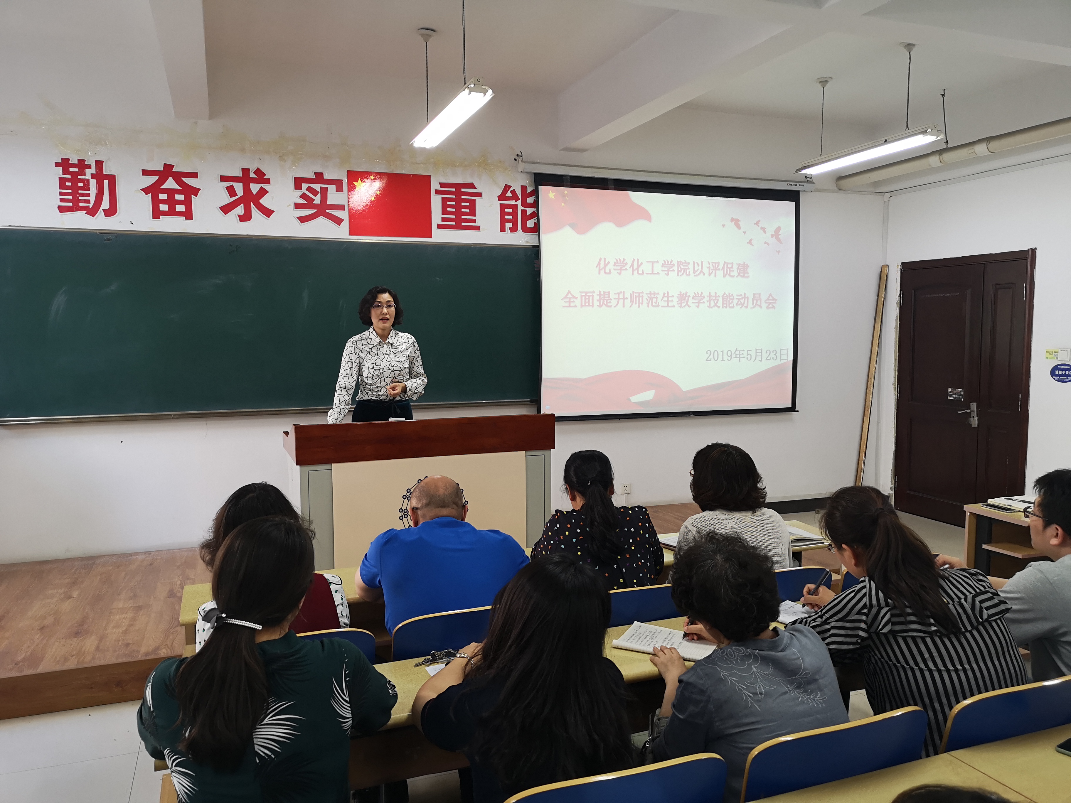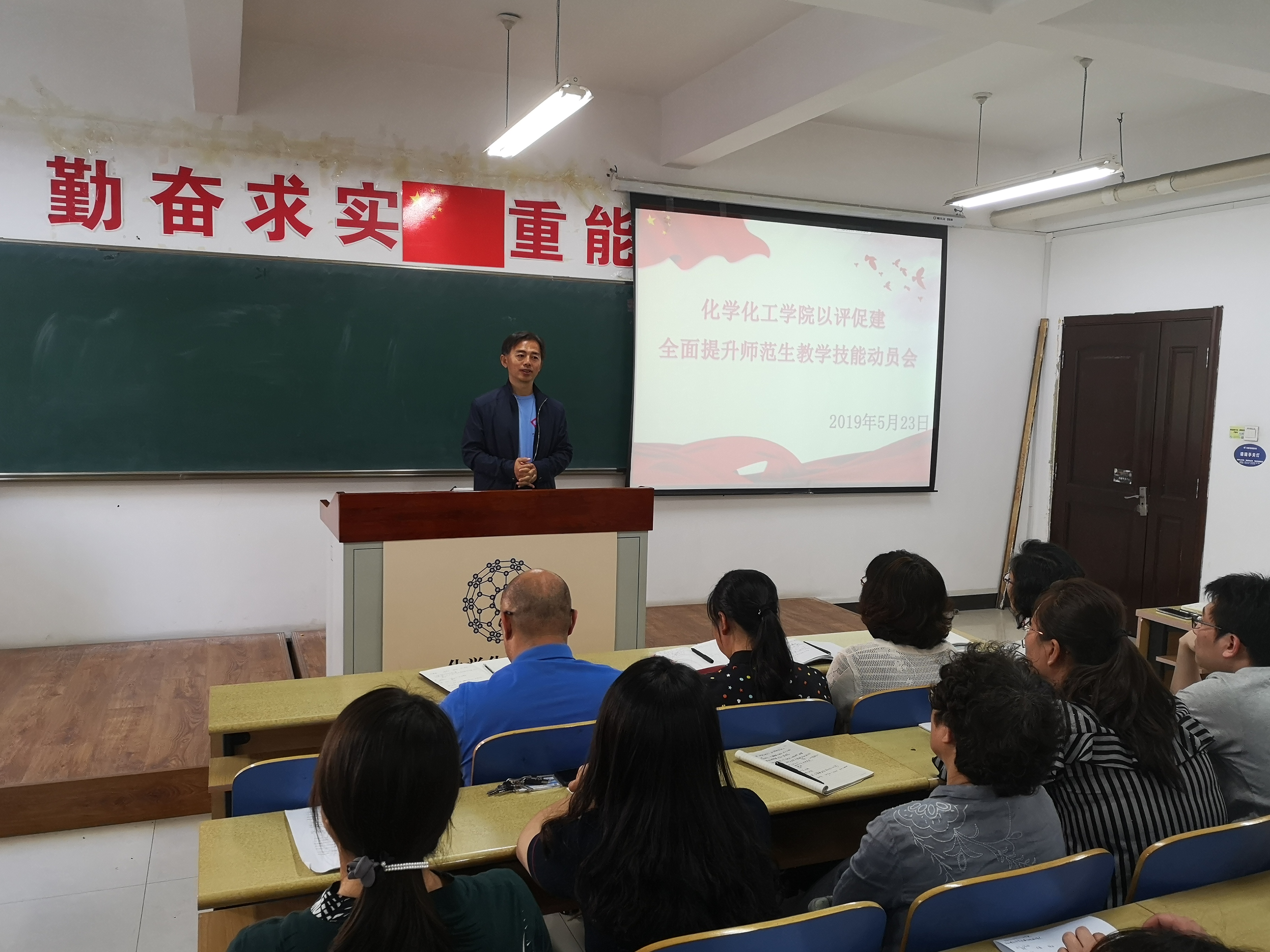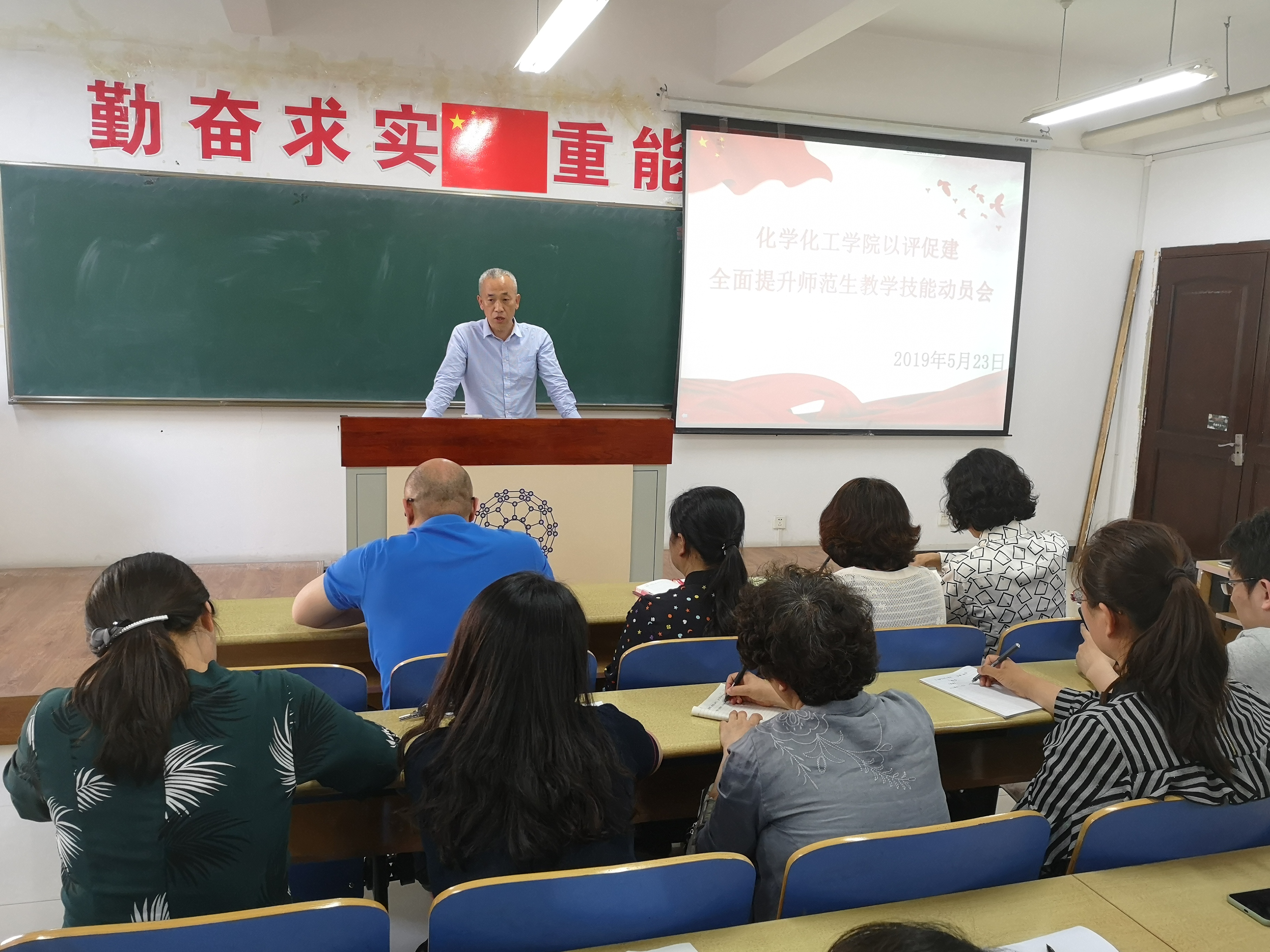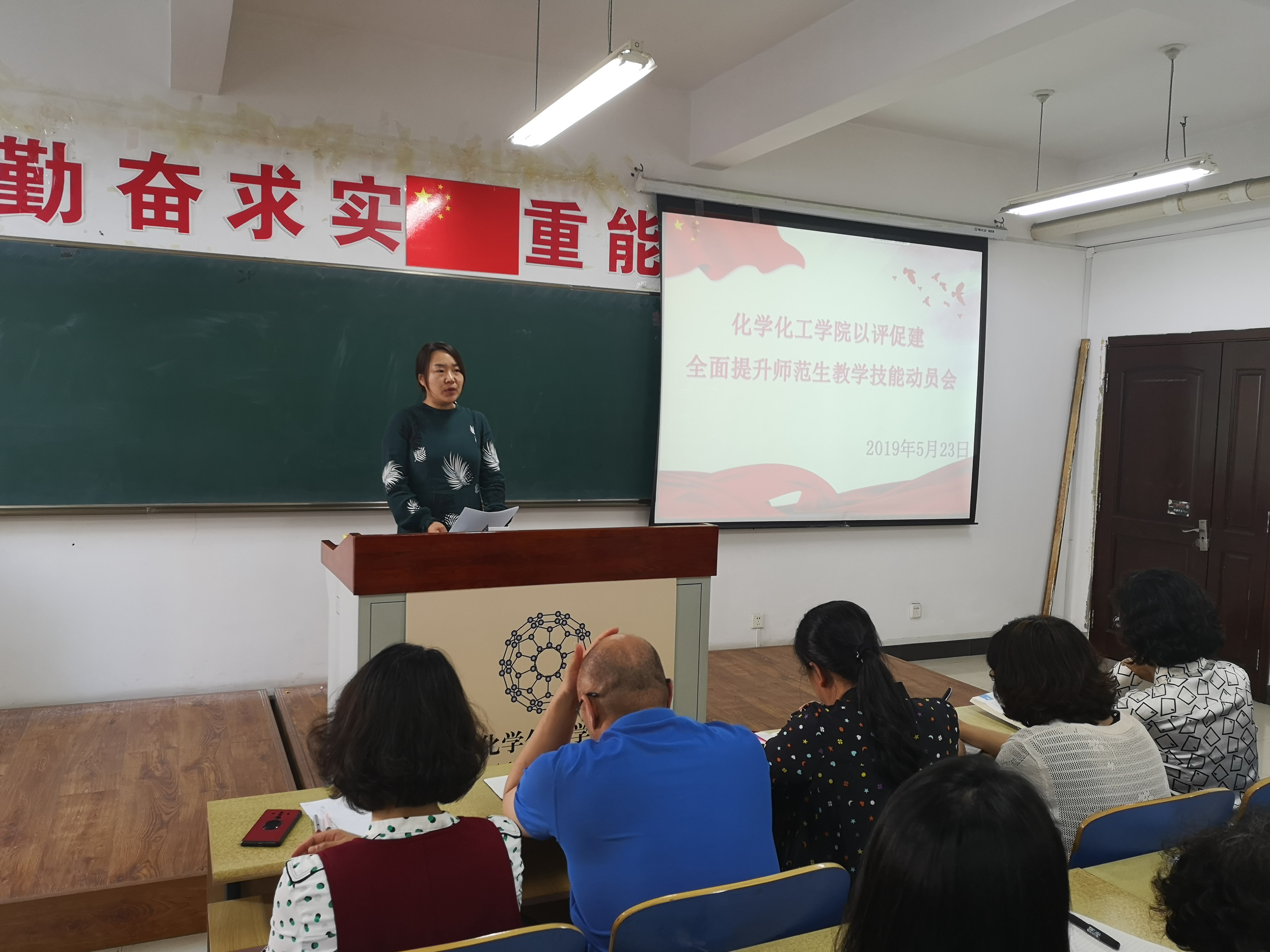 在理化楼411召开“以评促建,全面提升师范生教学技能”主题活动动员大会。学院党委书记刘智广、院长王长生、党委副书记李金英、副院长金晶,学院化学教育研究所所长王秋、学院教学技能训练组白凤英、迟玉贤、单文娟、刘翠、朱江、张琳、李书实,团委书记苑朋栋、原2015级辅导员肖虹以及2015级化学师范专业全体同学参加了会议。会议由党委副书记李金英老师主持。