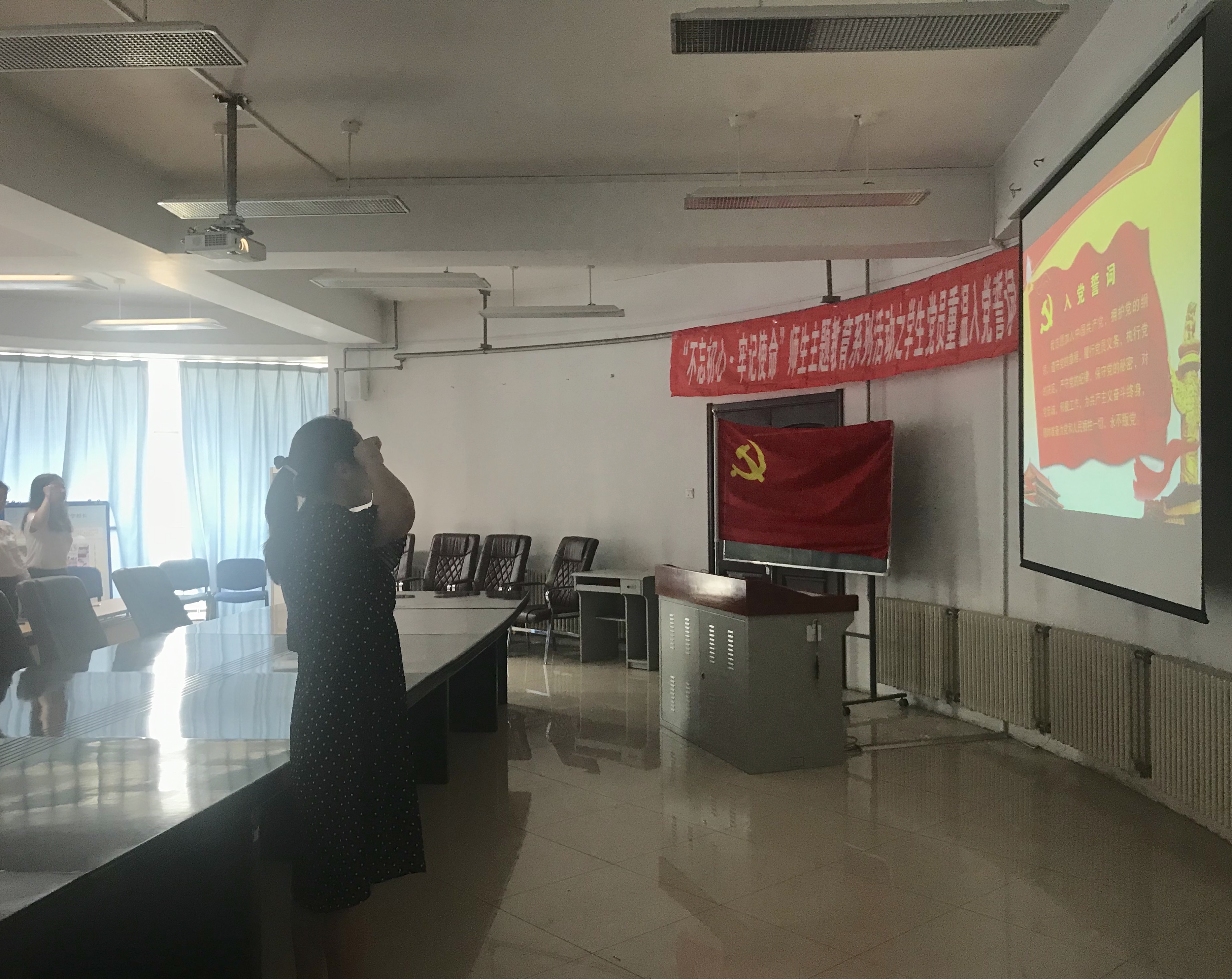随后,院党委李金英副书记带领学生党员进行新党员入党宣誓和老党员重温入党誓词。面对鲜红的党旗,同学们庄严宣誓,声音洪亮,信念坚定,鞭策和激励着全体党员不断进取,为党的事业奋斗终生!
