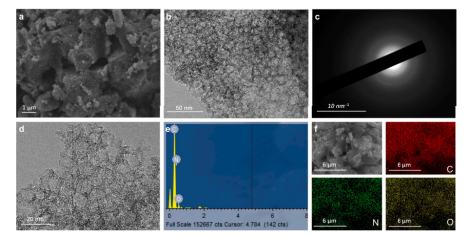 图2(a)meso-phen-900的SEM图像;(b)meso-phen-900的TEM图像;(c)meso-phen-900的SAED图像(d)meso-phen-900的HRTEM图像;(e)meso-phen-900的EDS分析;(f)meso-phen-900的Mapping图像