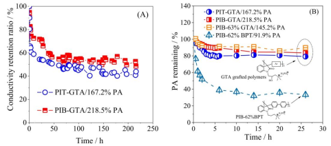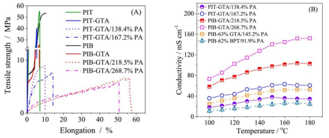 图2.PIB-GTA/PA膜和PIT-GTA/PA膜的机械应力-应变曲线(A)和质子电导率(B)